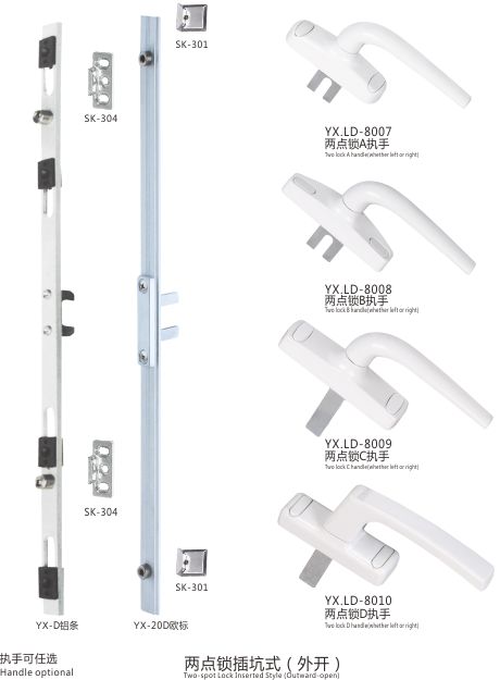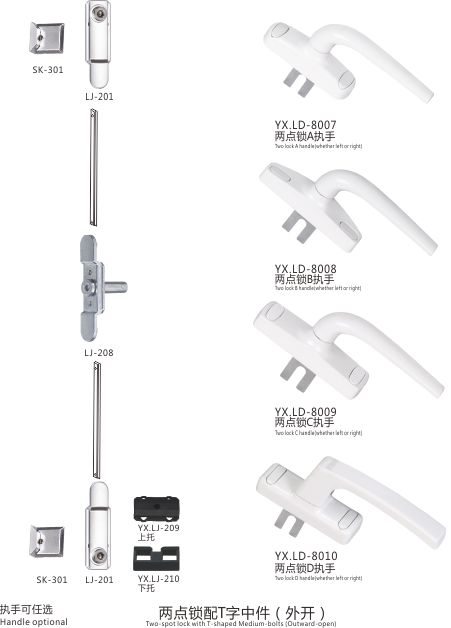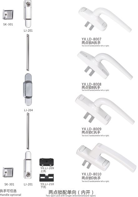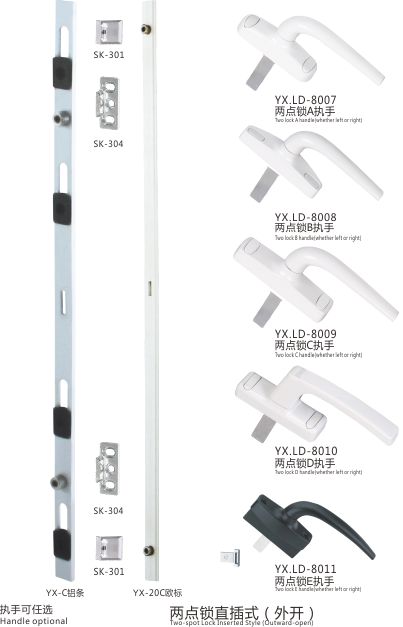 两点锁插坑式(外开) 两点锁配T字中件(外开) 两点锁配U字中件(外开) 两点锁配单向(内开) 两点锁直插式(外开) 幕墙多点锁(适用幕墙20槽) 幕墙三点锁